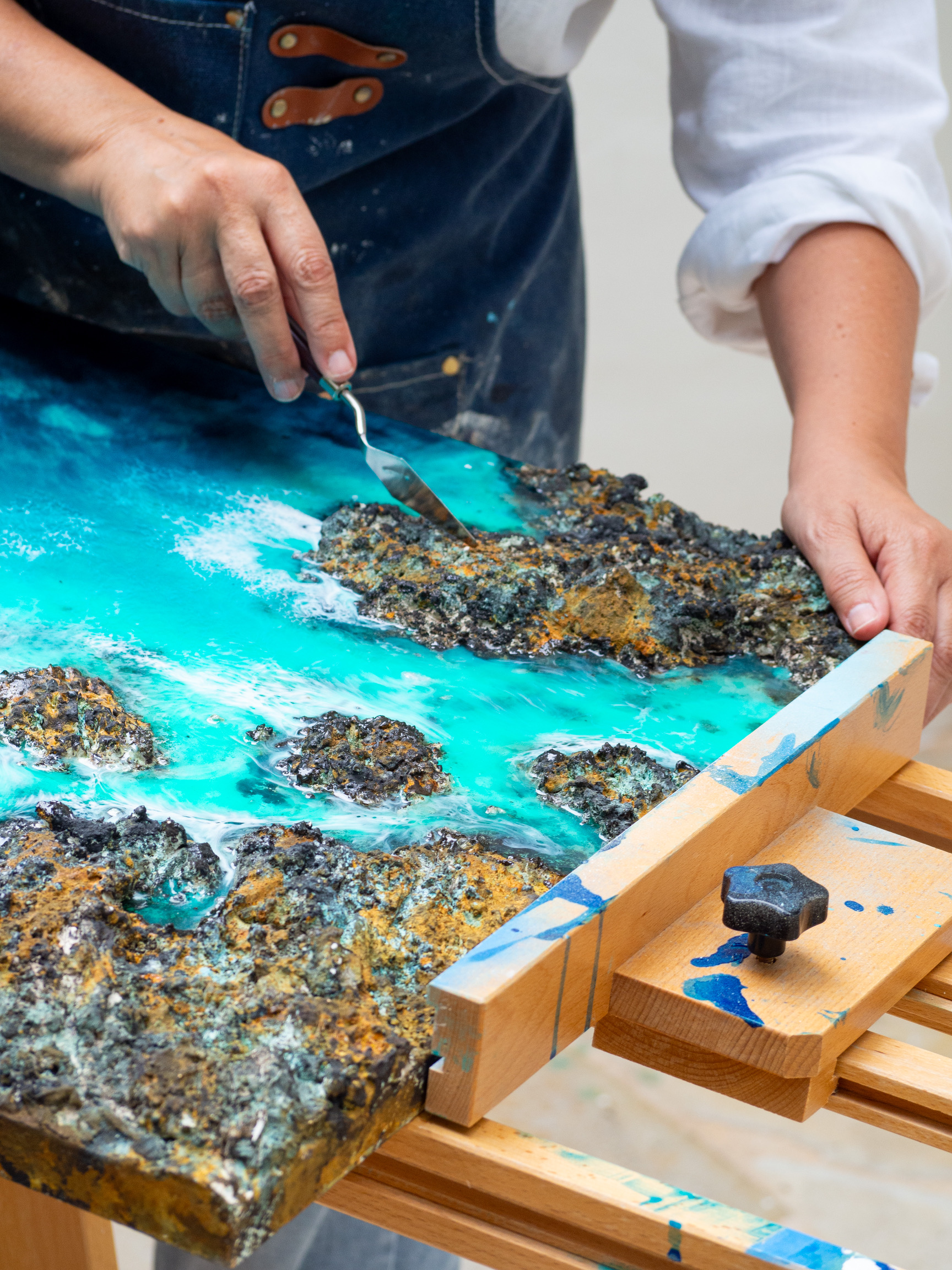 Mi trabajo se define por un lenguaje propio: textura, técnica mixta y el uso de pigmentos y materiales orgánicos. Esto me permite recrear momentos precisos, casi suspendidos, inspirados en vistas aéreas de océanos en movimiento, playas naturales e inmersiones en fondos marinos que parecen respirar.